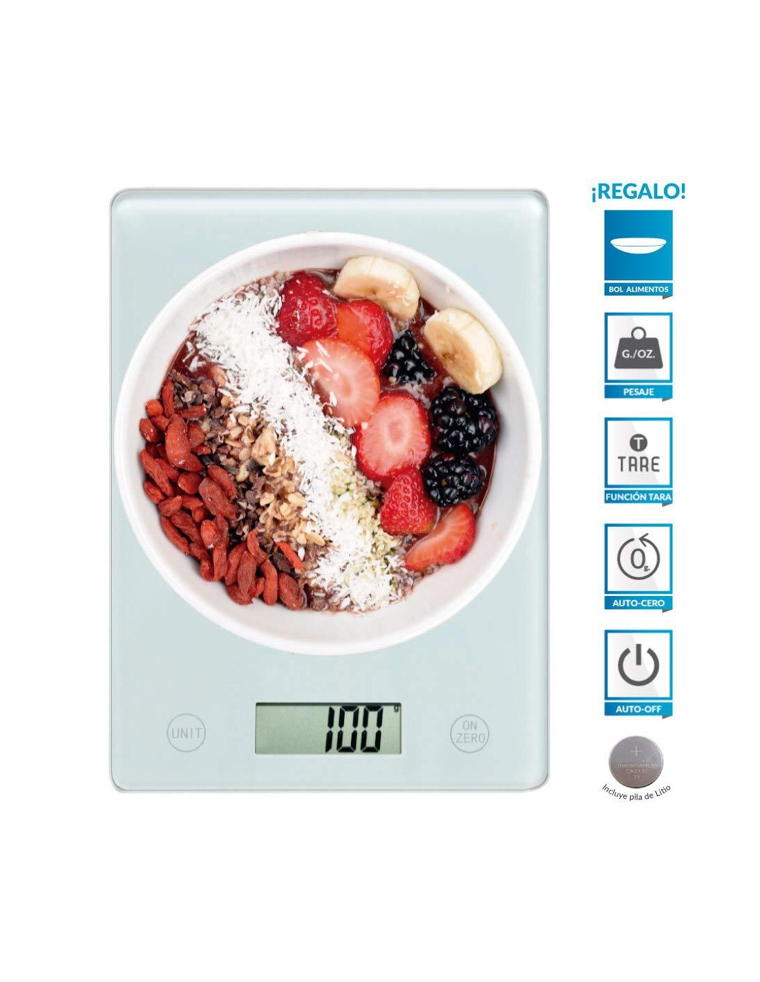 • Inclui uma tigela de plástico para pesar os alimentos.