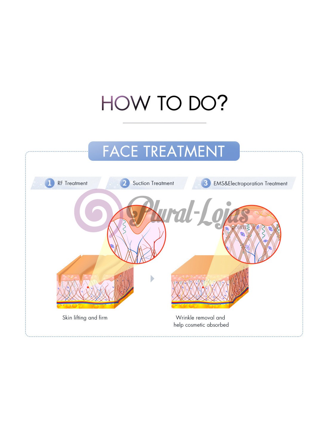 Electroestimulação Facial -Tratamento para melhorar o rejuvenescimento, o uso da micro-corrente , energia de activação de células é estimulada tornando a pele mais elástica revertendo o aspeto original, o colagénio é estimulado causando por toda a pele a estimulação de tensão muscular que é aumentada, gradualmente, eliminando rugas, prevê o envelhecimento da pele, restaurando a elasticidade da pele, facial.